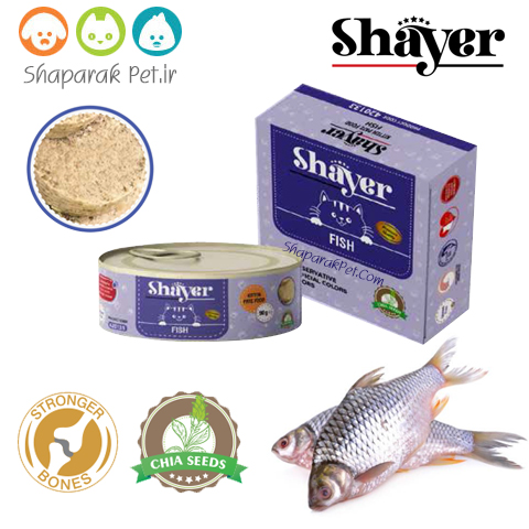 کنسرو پته ماهی شایر(shayer) مخصوص بچه گربه ها است. هر قوطی برای یک وعده مناسب است. نیاز به پروتئین در گربه های بزرگسال تا دو برابر بیشتر است و تامین این مقدار پروتئین فقط به وسیله مصرف کنسرو ها محقق می گردد. پروتئین کنسرو گربه شایر 15 درصد است که این محصول را از سایر برند های ایرانی متمایز میکند. به جرات میتوان گفت این محصول بهترین جایگزین برای کنسرو های گرمه می باشد. این محصول با کیفیت ساخت ایران میباشد. وزن کنسرو 90 گرم است.